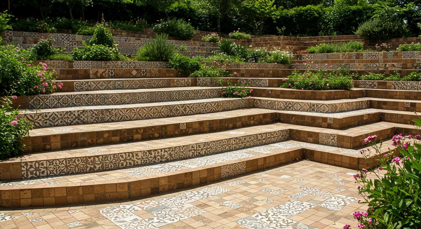 Для террасированных участков рекомендуется использовать плитку с высокой прочностью и устойчивостью к влаге, морозу и перепадам температур. Формы плитки могут быть квадратными, прямоугольными или фигурными, а текстуры — гладкими, рифлеными или имитирующими натуральный камень. Выбор цвета позволяет создавать контрастные или гармоничные сочетания с растениями и другими элементами ландшафта. Декоративные бордюры, встраиваемые светильники и вставки из камня или мозаики делают террасу более выразительной и функциональной.