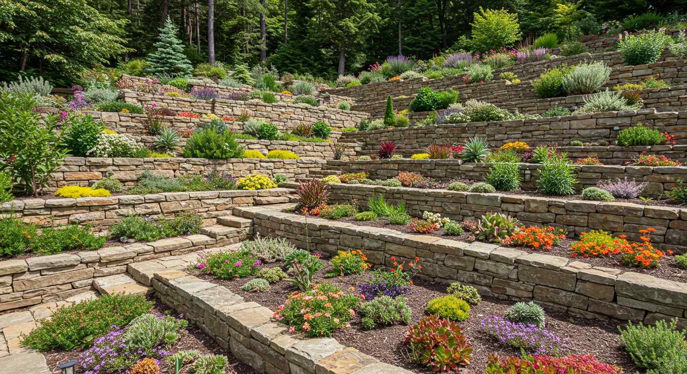 Комбинация камней разного размера и цвета помогает формировать естественные композиции, подчеркивать высоту и глубину террас, создавать дорожки и зоны отдыха. Для декоративного эффекта можно использовать плоские камни для стеллажей и границ клумб, а также встроенные подпорные стены из камня, которые удерживают грунт и создают гармоничное оформление склона.