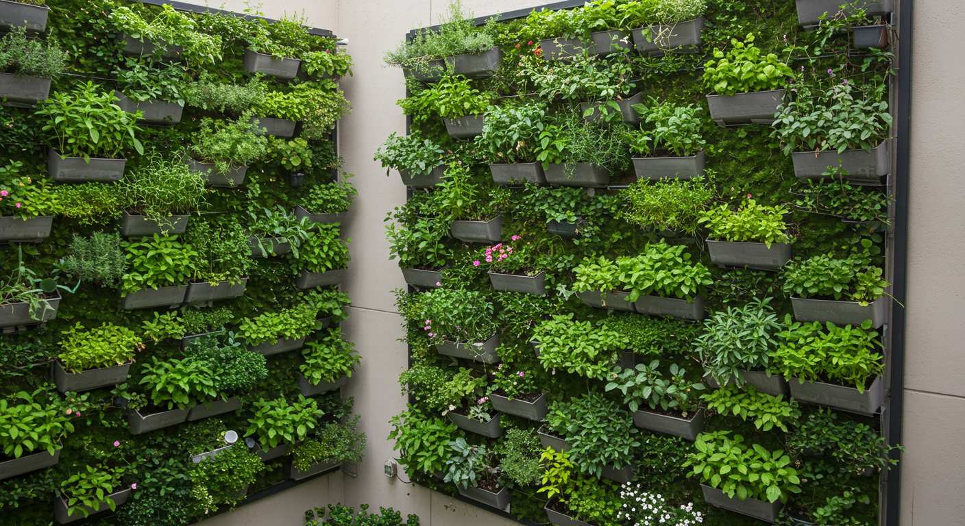 - Вертикальные модули и сетки — создают живую стену с ячейками для растений;