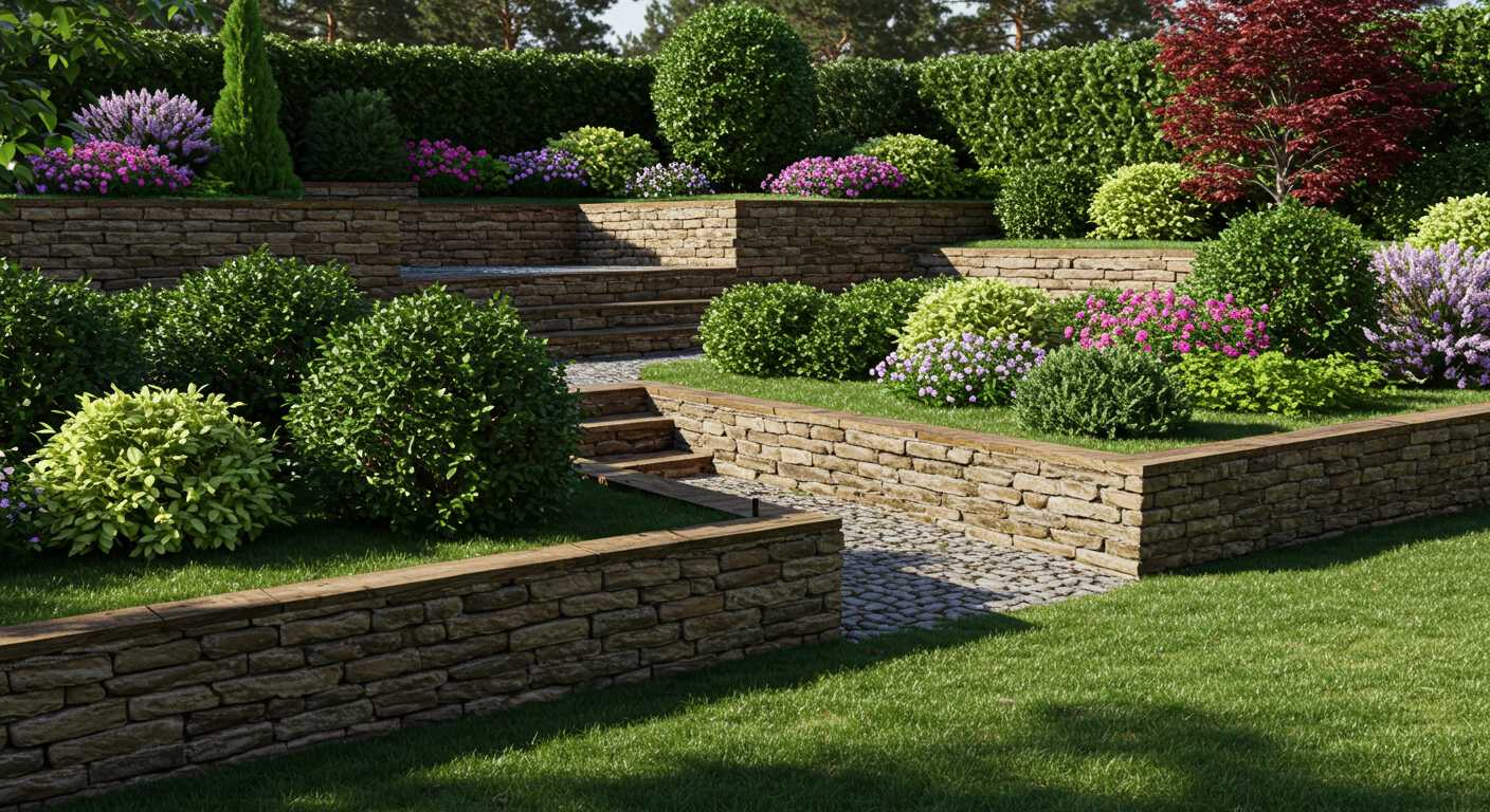 Для террасированных участков выбирают кустарники, подходящие по высоте, окраске листвы и периоду цветения. Часто используют комбинации хвойных и лиственных растений для создания контраста и текстуры. Материалы для укрепления террас подбираются с учетом долговечности и эстетики: натуральный камень, декоративный кирпич, дерево или металлические конструкции. Растения можно дополнительно укреплять почвопокровными видами, которые защищают почву от пересыхания и эрозии.